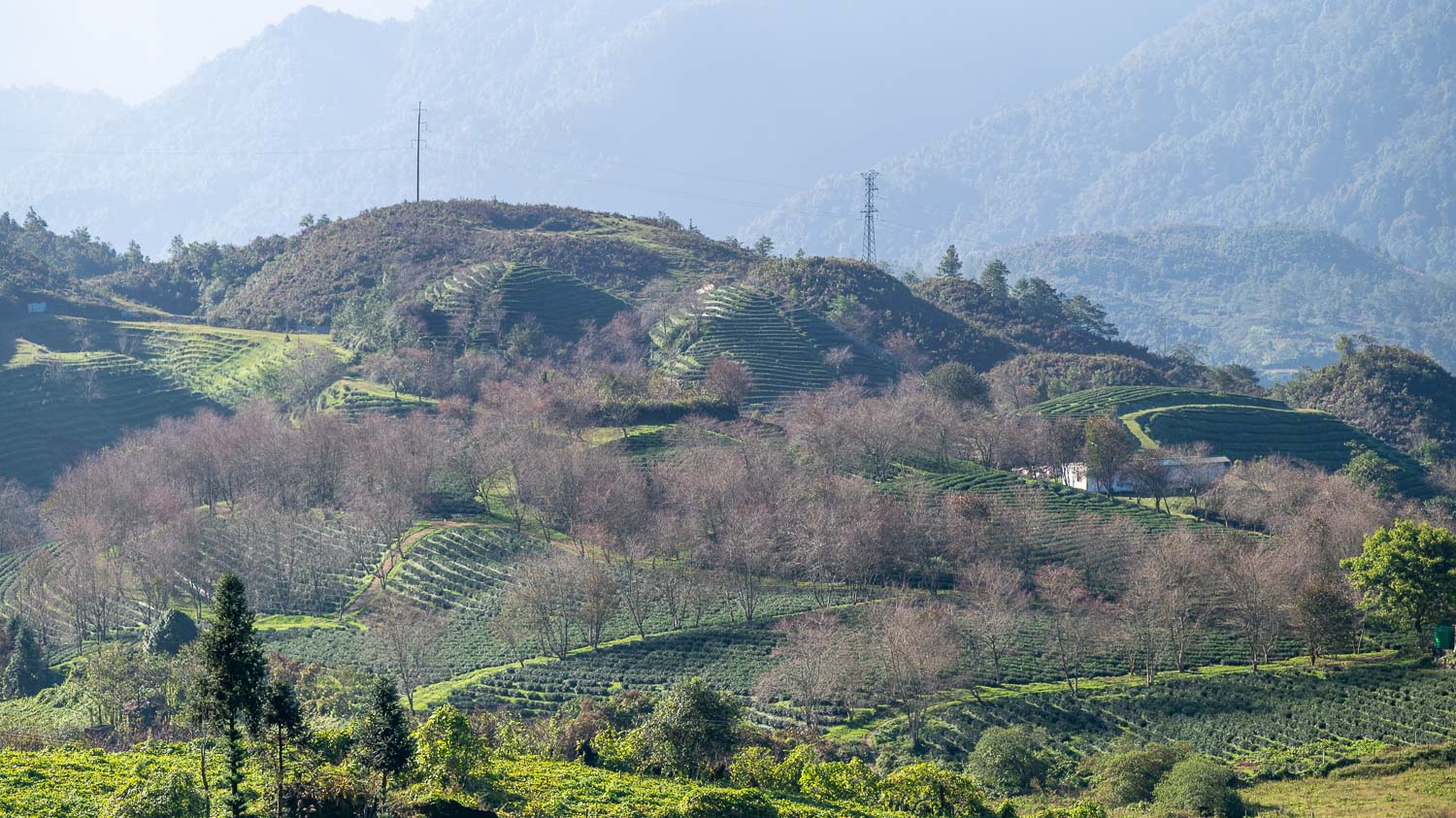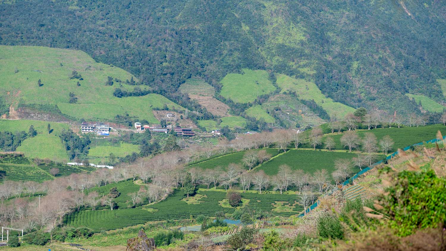 由於茶園也類似梯田的方式隨著地勢而種植,所以延伸出來的線條相當好看,而紫紅櫻花則是讓翠綠的畫面增加許多繽紛色彩及浪漫情懷。